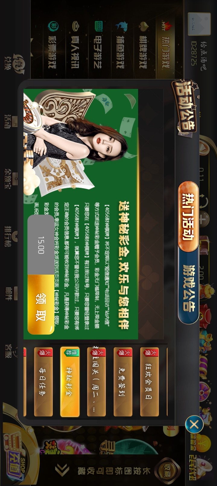 老台子了登录活动里面神秘彩金领取以前充过,好久没充值过了我v3的号才15
