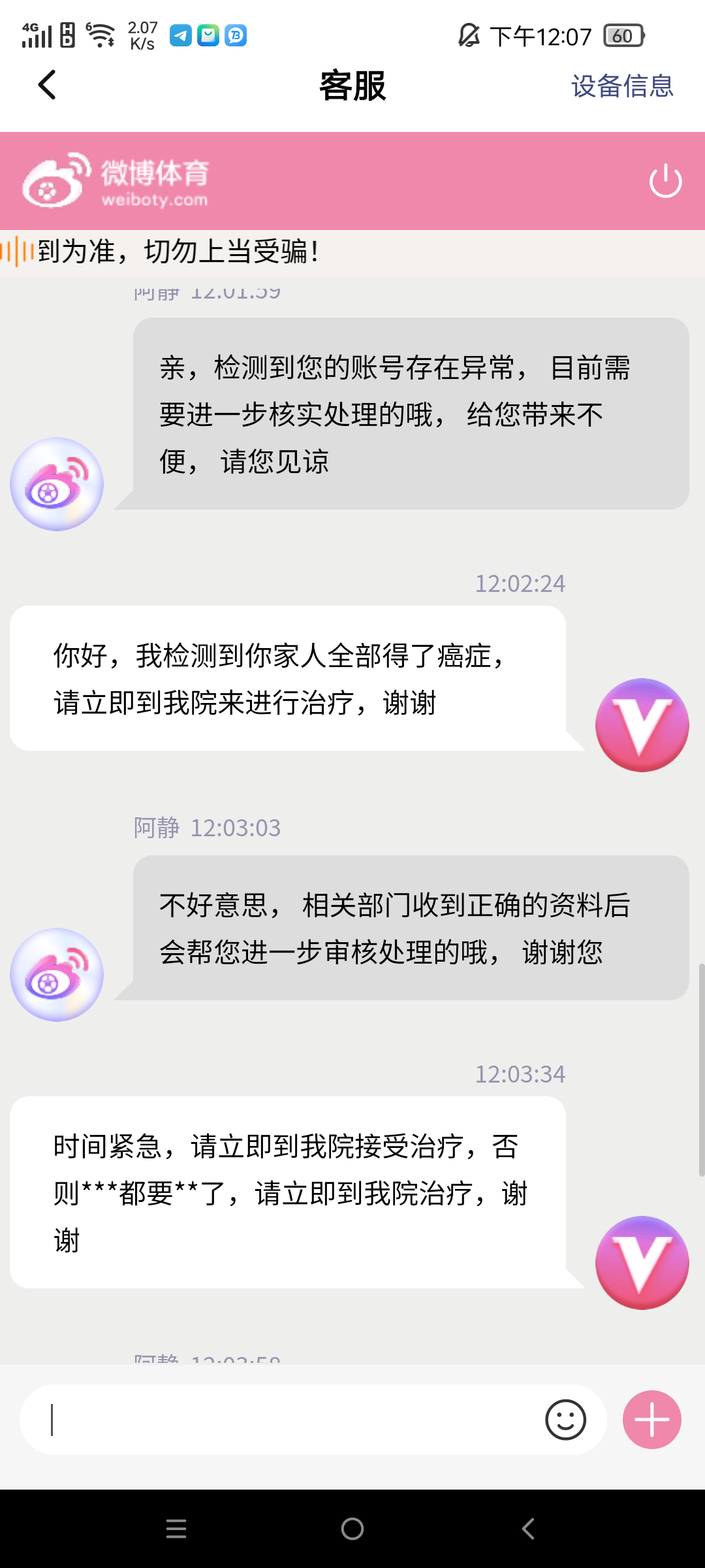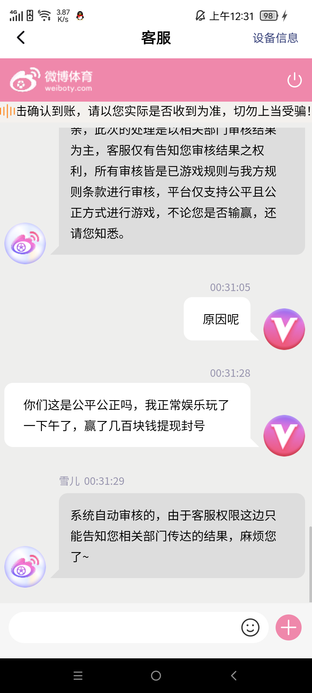 昨天充值450元,玩了几场电竞,还中了一个六合彩提现,800块,平台禁止提现,直接毫无理由的封号,客服装死一直复制粘贴消息,无任何违规操作投注,紧急避坑!