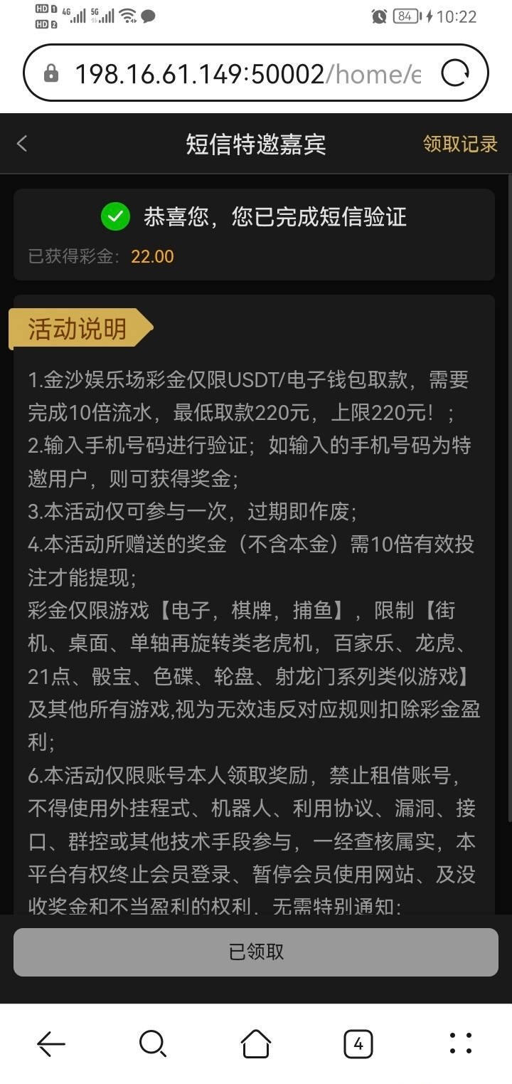 我两个手机号都领了,只有一个手机号收到短信,可以碰瓷,没打出来,出款自测